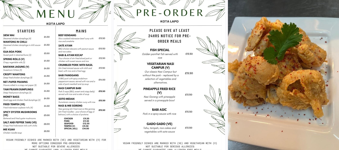 Welcome to Kota Lapo Indonesian Street Food, where the vibrant flavors of Indonesia come to life! Located in Hadfield, Glossop, our casual eatery offers a delightful selection of healthy options, quick bites, and small plates perfect for lunch or dinner. Indulge in our signature dishes like babi panggang and beef rendang, crafted with fresh ingredients and authentic spices. Whether you're dining solo or with friends, our welcoming atmosphere ensures a memorable experience. Enjoy the convenience of takeaway or dine-in service, and take advantage of our free parking. Come savor the taste of Indonesia at Kota Lapo!Diners rave about the authenticity of the dishes, feeling transported to Indonesia with every bite. The beef rendang stands out for its rich flavors and tender meat, leaving many craving more. The babi panggang, characterized by its crispy texture and succulent pork, receives high praise regularly. Guests appreciate the small plate options, which offer a chance to sample multiple dishes in one visit. The friendly service is another highlight, with the owners often taking the time to explain the dishes and share stories behind them. The casual atmosphere makes it relevant for both solo diners and families, creating a sense of community.